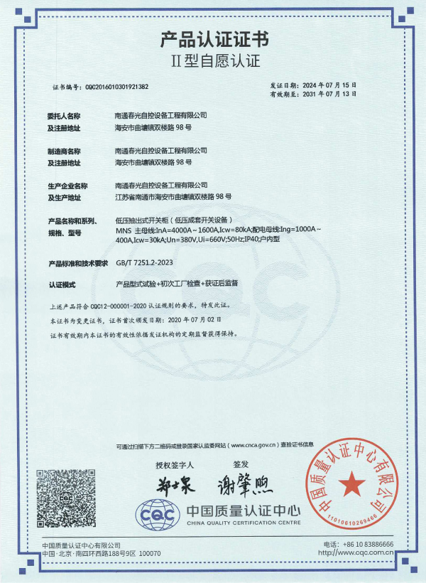 交流低壓配電柜認證證書